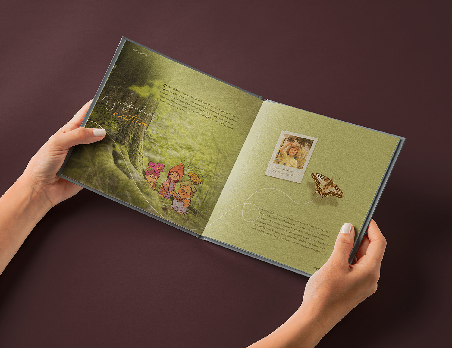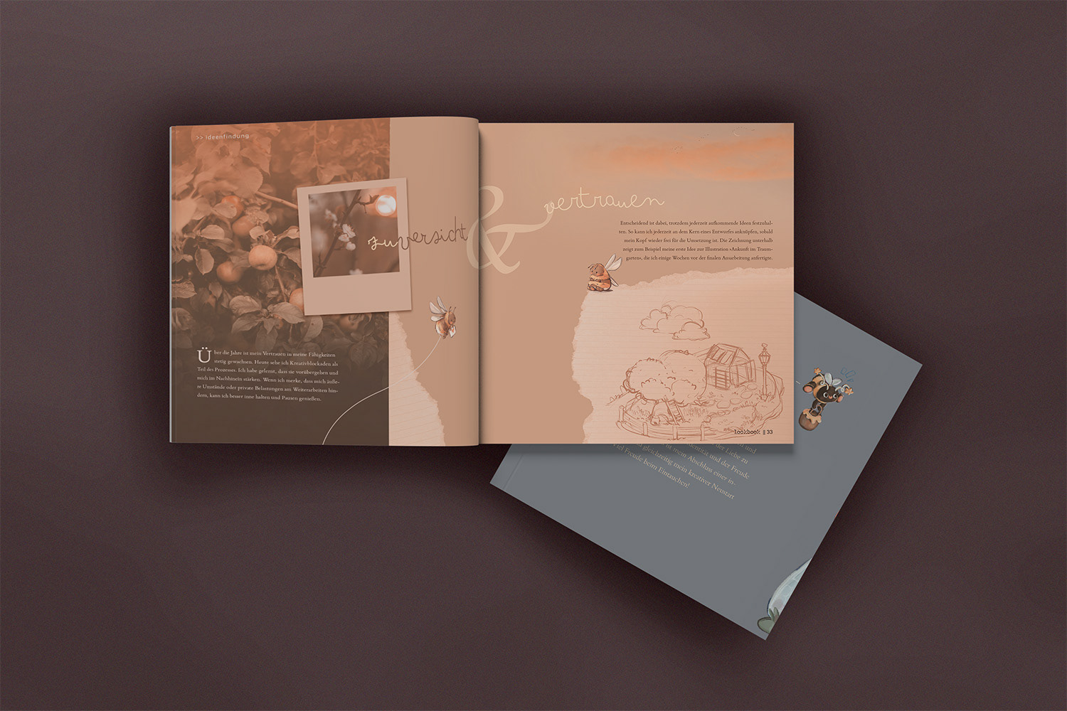 Zentrale Idee meines Lookbooks war es, ein Medium zu schaffen, das einen tieferen Einblick in meine Stilfindung als Kinderbuch-Illustratorin gibt. Während der einzelnen Kapitel werden verschiedene Etappen in meinem Leben näher beleuchtet, die mich dahingehend geprägt haben. Stilistisch war es mir vor allem wichtig meine enge Verbindung zur Natur und Tieren darzustellen und einen angenehmen Rhythmus zwischen Bild- und Textelementen zu schaffen.
